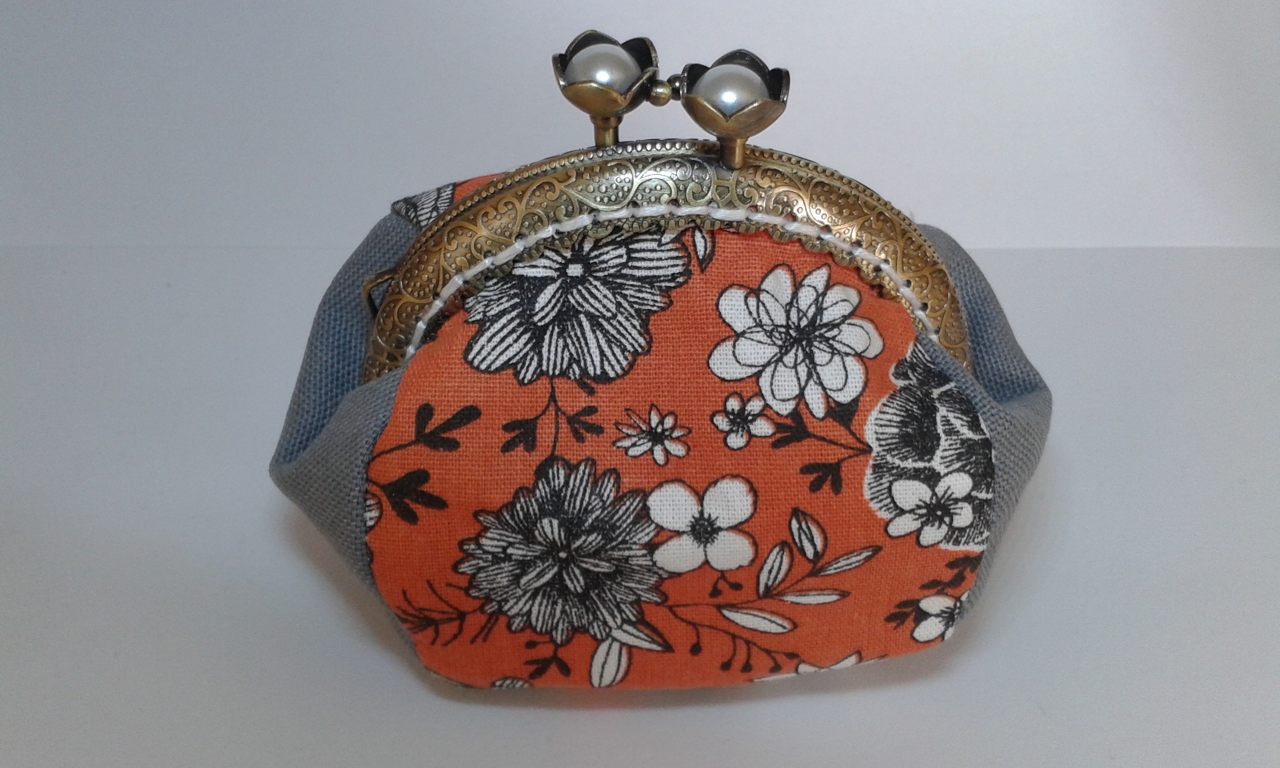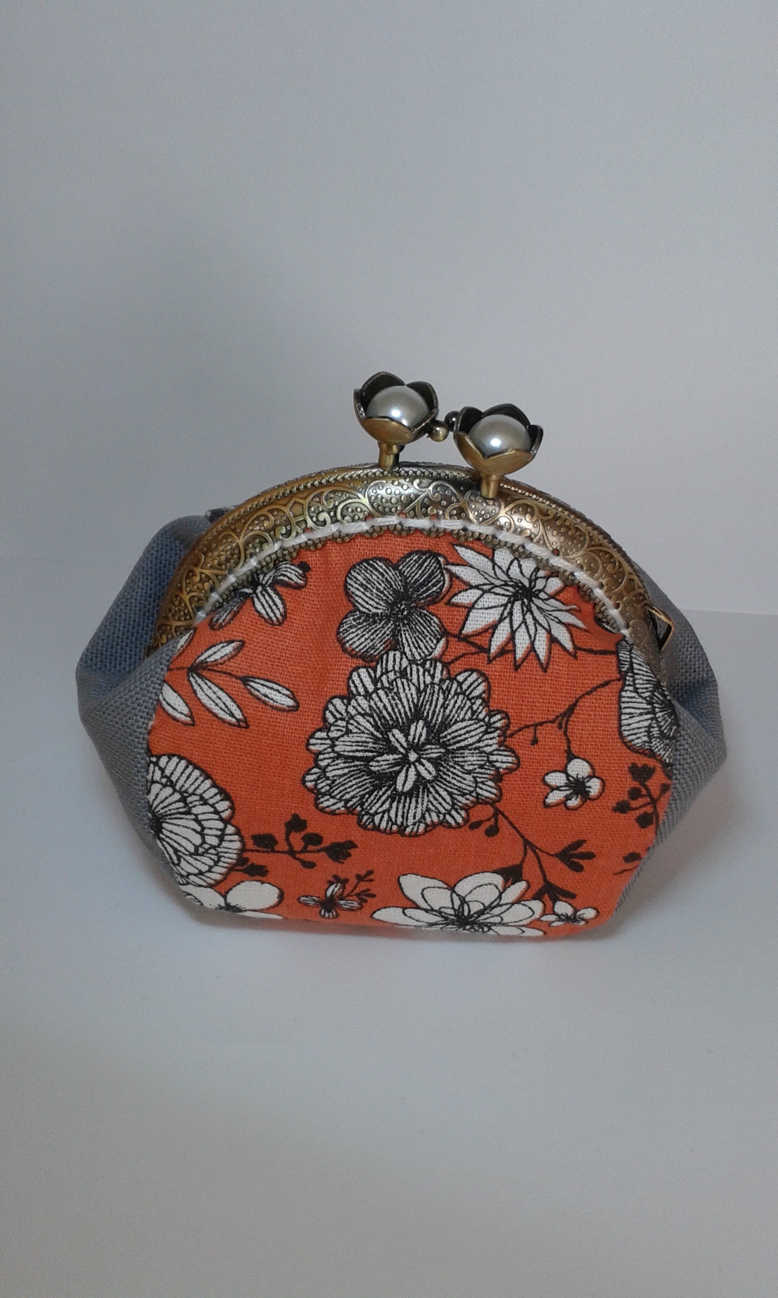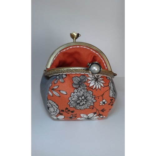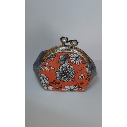 Porte monnaie fleurs, gris, blanc et noir sur fond orange, fermoir métal perle argent, porte monnaie femme, doublé et entoilé, idée cadeau