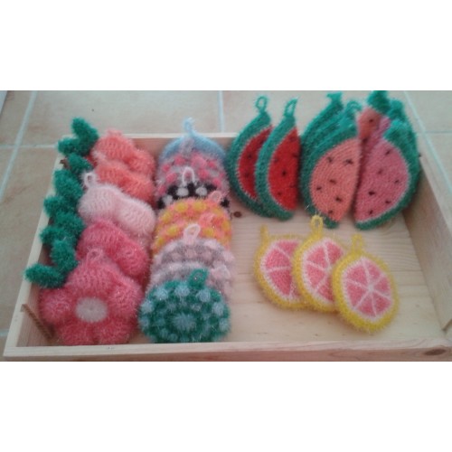 Cette éponge remplace le coté vert d'une éponge normal. Elle est crochetée dans un fil 100% polyester étudié pour cet ussage. Lavable jusqu'à 60%, elle ne sent jamais mauvais.